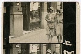 [Mujeres con sombrero caminando por calle céntrica] [fotografía]. [Santiago? : 192-?]. 1 fotografía : monocromo, gelatina sobre papel fibra ; 14 x 9 cm. .