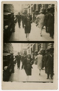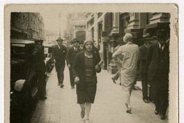 [Mujer caminando por una calle céntrica de la capital] [fotografía]. [Santiago] : 1930. 1 fotografía : monocromo, gelatina sobre papel fibra ; 14 x 9 cm. .