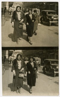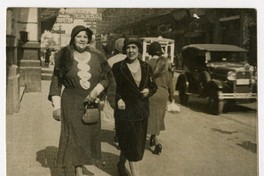 [Dos mujeres caminan por el centro de la cuidad] [fotografía]. [Santiago : entre 1920 y 1930]. 1 fotografía : monocromo, gelatina sobre papel fibra ; 14 x 8 cm. .