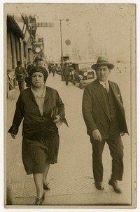 [Mujer con pañuelo en la cabeza caminando por una calle céntrica] [fotografía]. [Santiago : entre 1920 y 1930]. 1 fotografía : monocromo, gelatina sobre papel fibra ; 14 x 9 cm .