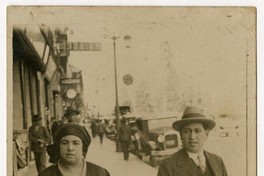Mujer con pañuelo en la cabeza y que sostiene su cartera con la mano, aparece en la fotografía caminando por una calle céntrica de Santiago, en la que se observa a un hombre con sombrero cerca, y a otras personas alrededor y automóviles estacionados.