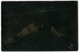 Pareja de mujer y hombre adultos, aparecen en la fotografía de frente a la cámara, recostados en Parque Cousiño, tal como se señala en la cara opuesta.