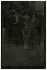 [Mujeres, hombres y niña reunidos] [fotografía]. [Chile : entre 1920 y 1930]. 1 fotografía : monocromo, gelatina sobre papel fibra ; 11 x 8 cm. .