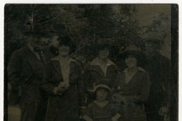 Tres mujeres con idénticos vestidos y sombreros, aparecen retratadas junto a tres hombres y una niña, en lugar no identificado. De fondo, se observa ramas de árboles.