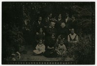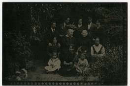 Grupo de personas reunidos en un jardín. En el centro, dos mujeres mayores aparecen retratadas junto a grupo de jovenes, dos de los cuales aparecen en la fotografía con instrumentos musicales; una joven con guitarra y un joven con violín. Junto a la mujer, hay una niña lleva cuello de marino, y un niño.