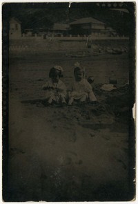 [Niñas en balneario] [fotografía]. [Chile : entre 1920 y 1930]. 1 fotografía : monocromo, gelatina sobre papel fibra ; 11 x 7 cm .