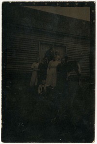 Joven y niña aparecen montados en un caballo detrás de cuatro mujeres que aparecen retratadas de pie. Atrás, un hombre con sombrero, y adelante de las mujeres, sentado en el suelo, un niño pequeño. De fondo, aparentemente, un establo de madera cerrado.