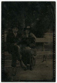 Pareja de mujer y hombre, ambos con sombrero y tomados de las manos, aparecen retratados en una banca de una plaza o parque no identificado.