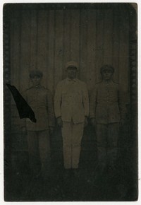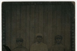 Tres uniformados, aparecen en la fotografía de pie delante de un muro de madera. Uno de los uniformados viste de blanco.