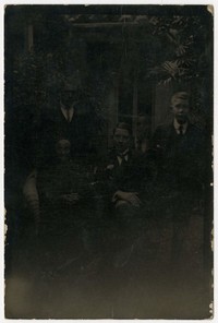 Mujer anciana con pañuelo en la cabeza, aparece en la fotografía sentada en sillón de mimbre y junto a un hombre y dos jovenes, en un jardín interior de una casa, de la que se observa la puerta.