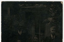 [Mujer y hombres en un jardín interior] [fotografía]. [Chile : ente 1920 y 1930]. 1 fotografía : monocromo, gelatina sobre papel fibra ; 11 x 7 cm .