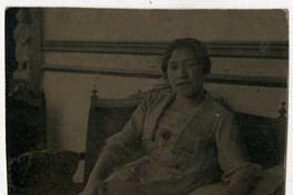 Mujer con cabello tomado, aparece en la fotografía sentada en un sillón y con un almohadón, presumiblemente, al interior de una casa.