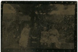 Hombre con sombrero, aparece en la fotografía sentado en la banca de un jardín, junto a dos jovenes y a dos niños. De fondo, se observa un pino y una cerca de madera, a los lados, un gomero y vegetación diversa.