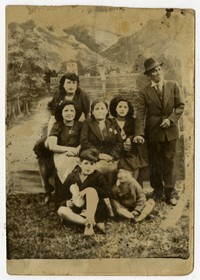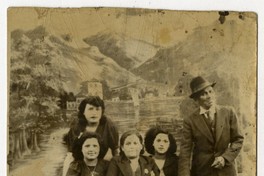 Grupo familiar compuesto por adultos y dos niños, cuyos nombres se indican más arriba, delante de un telón de fondo que tiene pintado un paisaje con montañas y un lago.