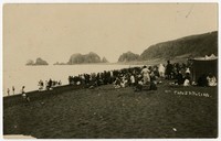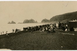 Vista al balneario de Constitución, en el que se observa a una multitud reunida a la orilla del mar, [playa Los Termopilas], además de las tiendas del lugar y de una cuerda de seguridad que lo atraviesa hasta el mar. De fondo, las distintas rocas de ese balneario.