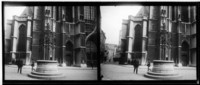Monocromas estereoscópicas en que se inmortaliza pozo de Quentin Massys de piedra adornado con hierro forjado, parte de la fachada de la catedral de Amberes.