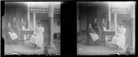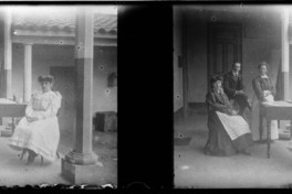 Monocromas estereoscópicas en que se inmortaliza escena familiar (niñas Huidobro Valdés) en galería de patio interior de la casa de Ismael Valdés Valdés en Chimbarongo.