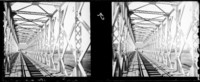 Monocromas estereoscópicas en que se inmortaliza el interior de un puente metálico y persona cruzando al fondo.