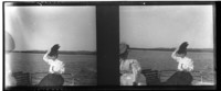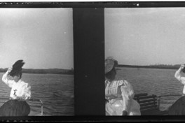 Monocromas estereoscópicas en que se inmortaliza mujer identificada como Josefina del Fierro, vestida con blusa blanca, falda oscura y un sombrero del mismo color y un quitasol en la mano izquierda con el rio de fondo.