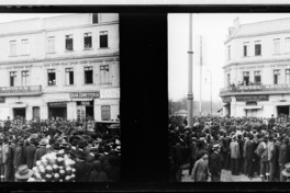 Monocromas estereoscópicas en que se inmortaliza un tumulto de gente frente al hotel Brinck, entre la multitud se ve carruaje con personas importantes en el, al lado del hotel esta el local Gran Confitería.