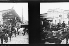 Monocromas estereoscópicas en que se inmortaliza un grupo de personas esperando la llegada de un tren en las puertas de la Estación Central, muchos hombres con sombrero y algunos subidos arriba de un coche con caballos.