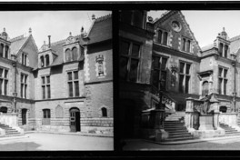 Monocromas estereoscópicas en que se inmortaliza parte del edificio, muestra la fachada de ladrillos, reloj y la escalera principal con la estatua de Juana de Arco.