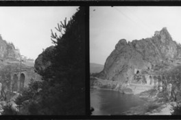 Monocromas estereoscópicas en que se inmortaliza viaducto de piedra en forma de arco entre montañas situada en Saint-Etienne, Francia.