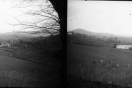 Monocromas estereoscópicas con vista a los llanos cerca de Saint-Étienne. En primer plano ramas de los árboles sin hojas, prado en el que las vacas pastan, en el fondo, se observan viviendas en una colina.