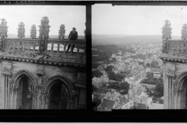 Monocromas estereoscópicas que muestra a un hombre en la torre Notre Dame de Mantes.