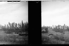 Monocromas estereoscópicas en que se inmortaliza grupo de personas ejecutando una faena de la trilla en el campo. Al fondo una línea de álamos.