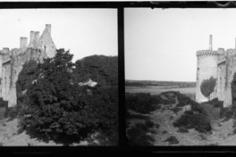 Monocromas estereoscópicas en que se inmortaliza la torre redonda de un castillo, cubierta por enredaderas con árboles, vista del patio interior, dos personas caminando a través de las ruinas del castillo.