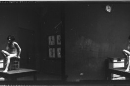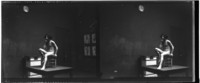Monocromas estereoscópicas en que se inmortaliza un hombre muy joven desnudo posando en un interior sentado en una silla, en el muro cuelga un reloj.