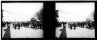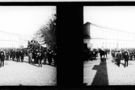 Monocromas estereoscópicas en que se inmortaliza la Ceremonia de entierro en el Instituto Nacional, un gran número de estudiantes alineados al edificio, algunos llevan el estandarte "Instituto nacional de Chile 1913".