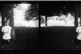 Monocromas estereoscópicas en que se inmortaliza a una niña delante de un árbol con vestido blanco y cintillo de flor, sostiene en sus manos una caja pequeña.