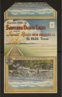 Canal street, looking west, New Orleans, LA. -- Lace work in iron, New Orleans, LA. -- Huey P. Long bridge, New Orleans, LA. -- Shadows on the Teche, New Iberia, La -- Harbor view of Beaumont, Texas -- San Jacinto Memorial Shaft, Houston, Texas -- Skyline, Houston, Texas -- Southern Pacific Depot, Houston, Texas -- Radolph Field near San Antonio, Texas -- Grand Canyon of Texas -- Pecos High on Southern Pacific Line, Sunset Route Near Del Rio, Texas -- The Alamo, San Antonio, Texas -- Calle King of the grat southwest -- Saw Tooth Mountain, Davis Mountain Range -- Bird eye view of Alpine, Texas -- Bird eye view, Marfil, Texas -- View of downtown El Paso -- The international bridge between El paso, Texas and C. Juarez, Mexico.