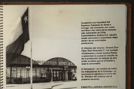 Visita efectuada por el Sr. Ministro del Interior General Don César Raúl Benavides E. a la planta de Embotelladora Andina S.A. 6 de Enero de 1977 / [fotografía] : Hernán Rojas Velasquez. Chile : Embotelladora Andina ; 1977. 1 álbum (22 fotografías) : fotomecanicas monocromas, colotipos, 11 hojas de cartón ; 18 x 26 x 3 cm. .