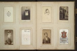 [Álbum de retratos familiares carte de visite] : [fotografía]. Chile : [Editor no identificado] , [Entre 1895 y 1920]. 1 álbum (45 fotografías) : fotografías monocromas, papeles a la albúmina, gelatina y plata sobre papel, 15 hojas de papel ; 33 x 24 x 3 cm. .