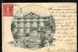 Tacna-Teatro Municipal [fotografía] / Carlos Brandt, Editor Valparaíso : Carlos Brandt , 1904. 1 tarjeta postal : colotipo, fotomecánico monocromo sobre papel ; 13,5 x 9 cm. .