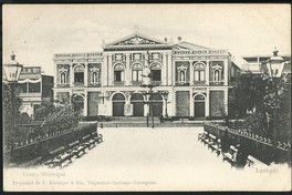 Fachada del Teatro, ubicada en el lado sur de la Plaza Prat, a su lado, vista parcial del "Almacén Capella Hnos." y faroles del alumbrado público en la Plaza Prat.