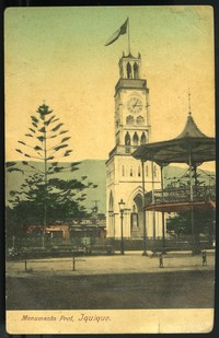 Materias: Historia - Fotografías - Iquique (Chile) - Monumentos - Tarjetas postales - Homenajes póstumos - Prat, Arturo - Prat Chacón, Arturo - Arte gótico - Plaza de Armas Arturo Prat (Iquique, Chile) - Relojes - Arte mudéjar - Oficina Salitrera Puntilla de Huara (Iquique, Chile)