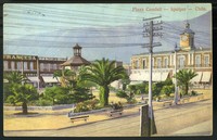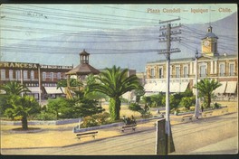 Plaza Condell - Iquique - Chile : [Vista parcial de la Plaza; Antiguo Mercado Municipal, ubicado en el costado oriente, en los altos , está la Escuela Profesional de Mujeres, un kiosco o glorieta de fierro al centro, se pueden apreciar casas comerciales como la "Casa Francesa, el "Gran Bazar La Giralda" y otros; Adornan la plaza, plantas, palmeras y escaños] [fotografía] / E. Mendez R. Iquique : E. Mendez R. , [Entre 1915 y 1926]. 1 tarjeta postal : cromolitograbado, planográfico policromo sobre papel ; 14 x 9 cm. .