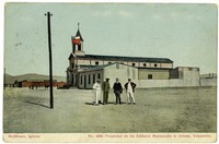 Mejillones, Iglesia : [Parroquia Corazón de María de Mejillones] [fotografía] / Mattensohn & Grimm. Tocopilla : Mattensohn & Grimm , 1911. 1 tarjeta postal : medio tono, fotomecánico policromo sobre papel ; 13,8 x 7,8 cm. .
