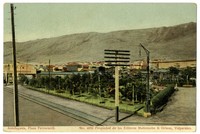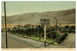 Antofagasta, Plaza Ferrocarril [fotografía] / Mattensohn & Grimm. Antofagasta : Mattensohn & Grimm , [1913]. 1 tarjeta postal : medio tono, fotomecánico policromo sobre papel ; 14 x 8,5 cm. .