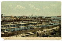 Muelle Miraflores; salitre y otras mercaderías en espera de ser embarcados.