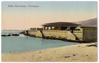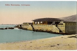Baños Municipales, Antofagasta : [La Poza Chica, Balneario Municipal; Casetas y Salón de Recreo] [fotografía] / Lemare & Co. Antofagasta : Lemare & Co. , [ca. 1927]. 1 tarjeta postal : colotipo, fotomecánico policromo sobre papel ; 14 x 9 cm. .