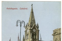 Antofagasta, Catedral : [A su izquierda, el Club Inglés, hoy Banco Corpbanca, a la derecha, edifcio color beige, el Banco Yugoeslavo, Hoy Banco Santander] [fotografía]. Antofagasta : [Editor no identificado , Entre 1910 y 1920]. 1 tarjeta postal : colotipo, fotomecánico policromo sobre papel ; 14 x 9 cm. .