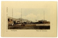 Plaza del Centenario, Antofagasta : [Ubicada en la Avenida Brasil: Vista del kiosco de la Retreta, realizado en metal, obsequiado y construido por los hermanos Orchard y sus operarios y los escaños donados por la Colonia Sirio-Otomana, en el Centenario de la República de Chile] [fotografía] / Justo Arce S. & Cía. Antofagasta : Justo Arce S. & Cía. , [Entre 1910 y 1925]. 1 tarjeta postal : colotipo, fotomecánico policromo sobre papel ; 10 x 5 cm. .