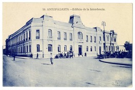 16. Antofagasta-Edificio de la Intendencia : [Góndola (transporte colectivo) y automóviles, frente a la Intendencia] [fotografía] / Foto Villalon. Antofagasta ; Foto Villalon [1925]. 1 tarjeta postal : colotipo, fotomecánico monocromo sobre papel ; 14 x 9 cm. .