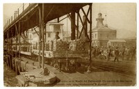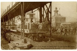 Antofagasta-Embarque de cobre en el muelle del Ferrocarril. Un convoy de diez carros cuyo contenido vale aproximadamente $700,000 : [En segundo plano, se observa la parte superior del Hotel Belmont, hoy, Centro Cultural Estación Antofagasta] [fotografía]. Antofagasta: [Editor no identificado , Entre 1915 y 1920] 1tarjeta postal ; huecograbado, fotomecánico monocromo sobre papel ; 13,7 x 8,7 cm. .