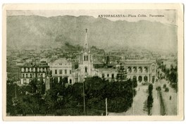 Antofagasta-Plaza Colón. Panorama : [Calle San Martín, frente a la Plaza Colón: de izquierda a derecha, el Gran Hotel; el Club Inglés; La Catedral; la Vicaría Apostólica y el Banco Español de Chile] [fotografía]. Antofagasta : [Editor no identificado , Entre 1907 y 1920]. 1 tarjeta postal : medio tono, fotomecánico monocromo sobre papel ; 13 x 8 cm. .